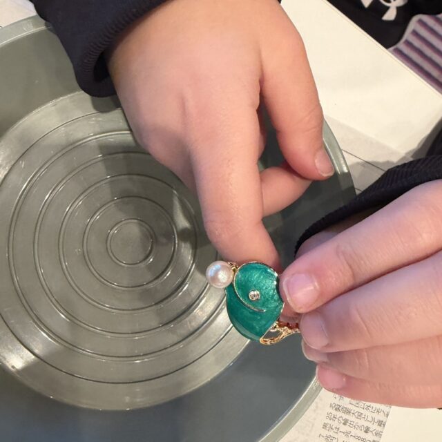 今日のアクセサリー作りで、自分たちの真珠が作品として形になり、世界にひとつだけのブローチが完成しました。