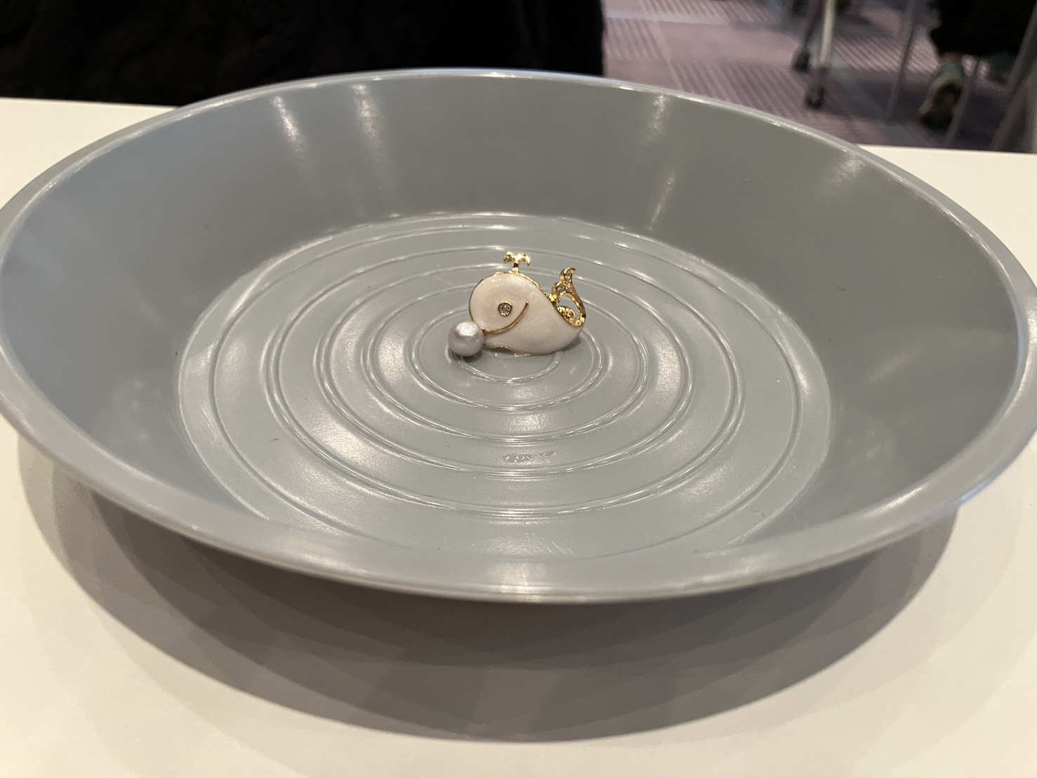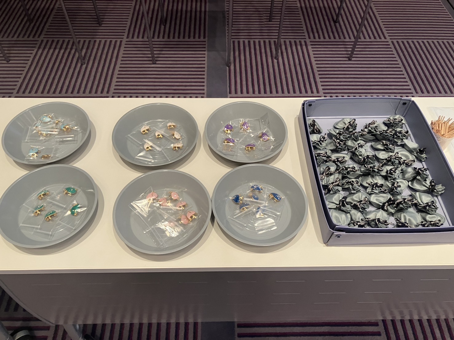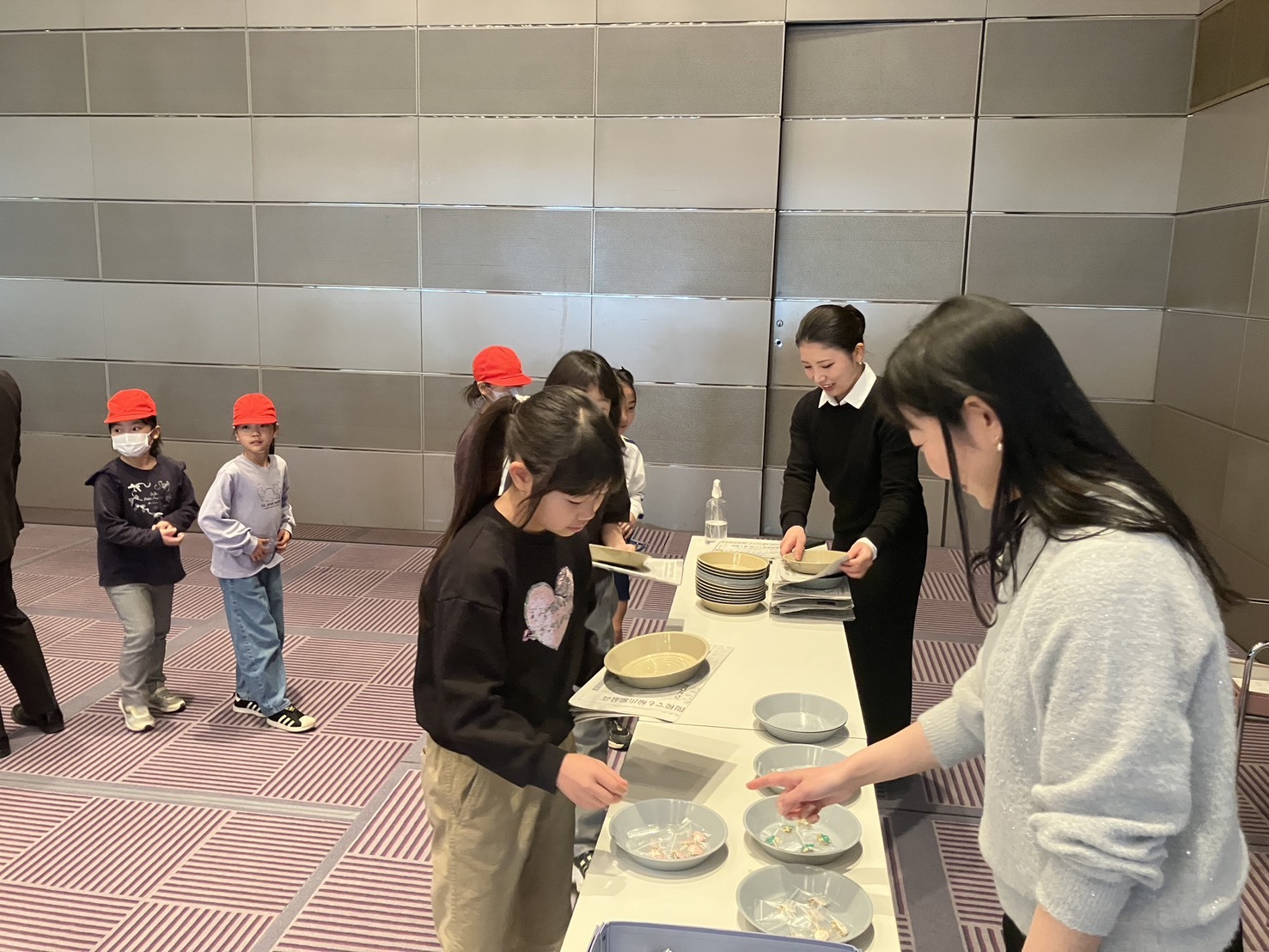 その後、みんながそれぞれ選んだ色のクジラのブローチを受け取り、続いて真珠が入った小さなポーチを1つずつ手に取っていきます。