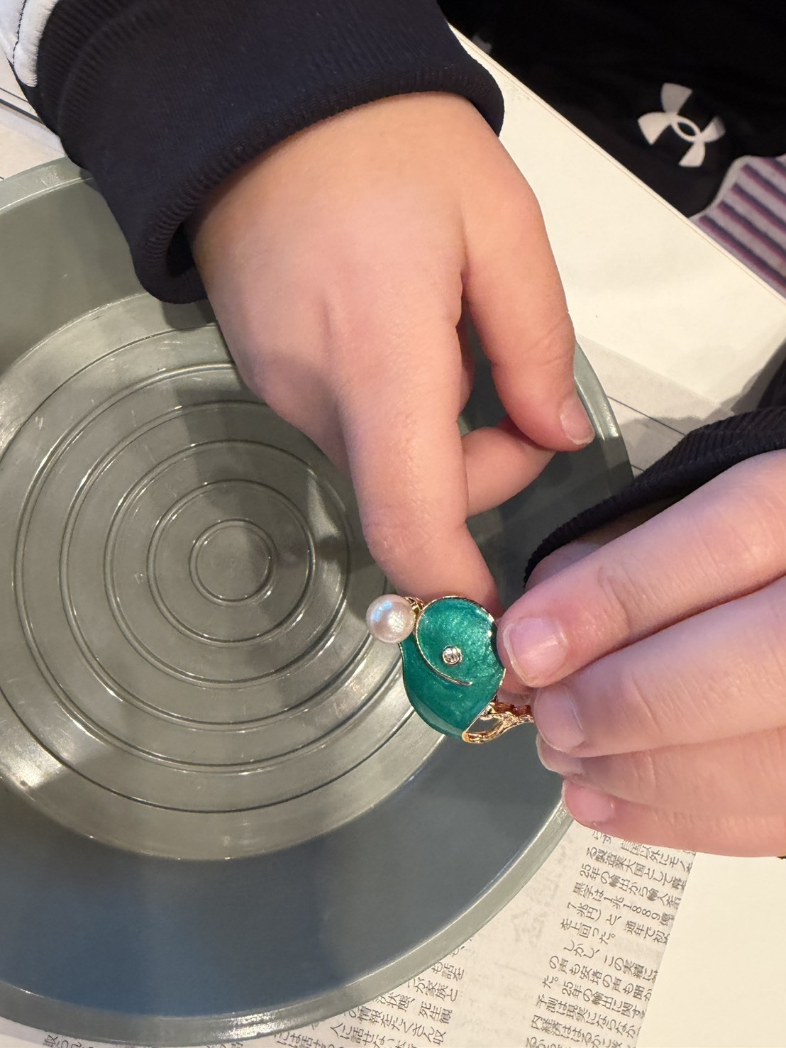 今日のアクセサリー作りで、自分たちの真珠が作品として形になり、世界にひとつだけのブローチが完成しました。