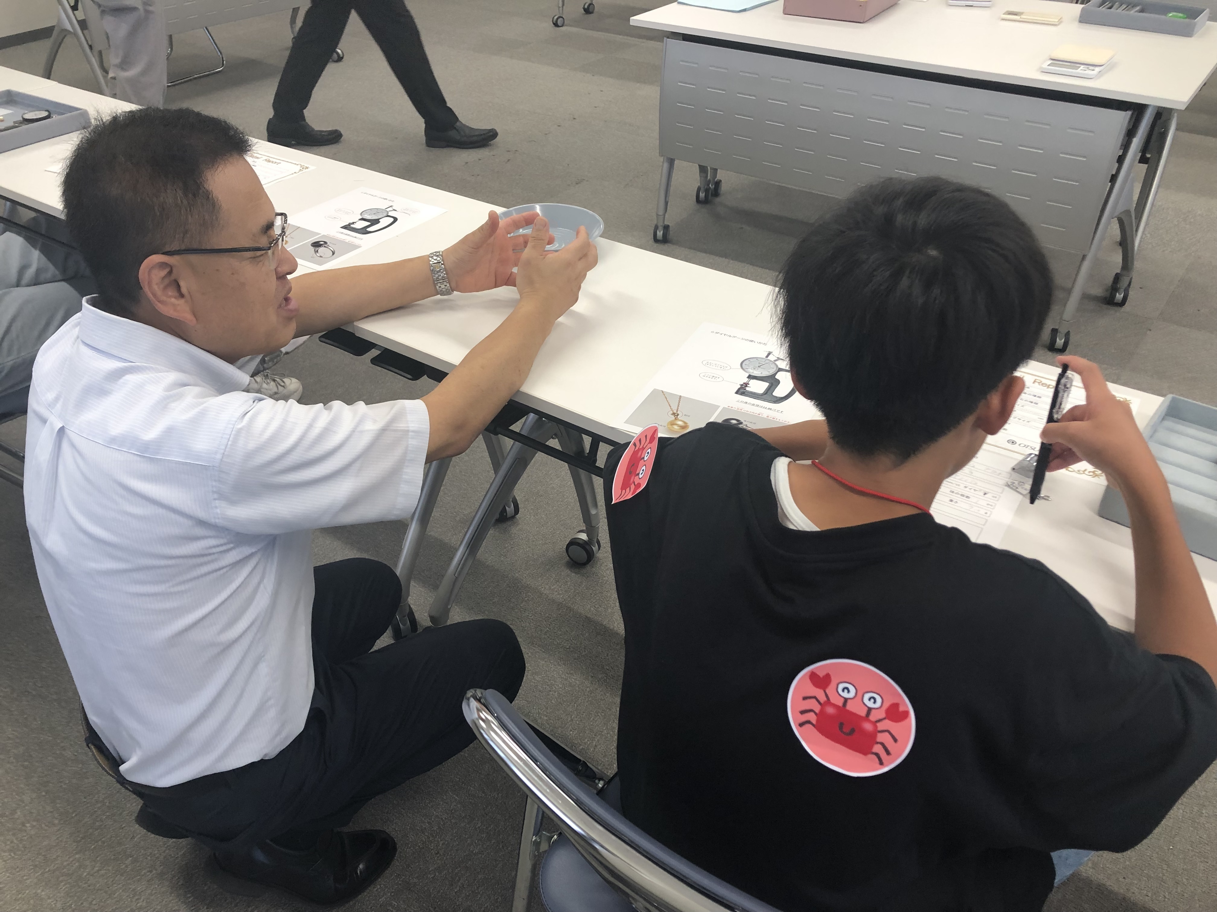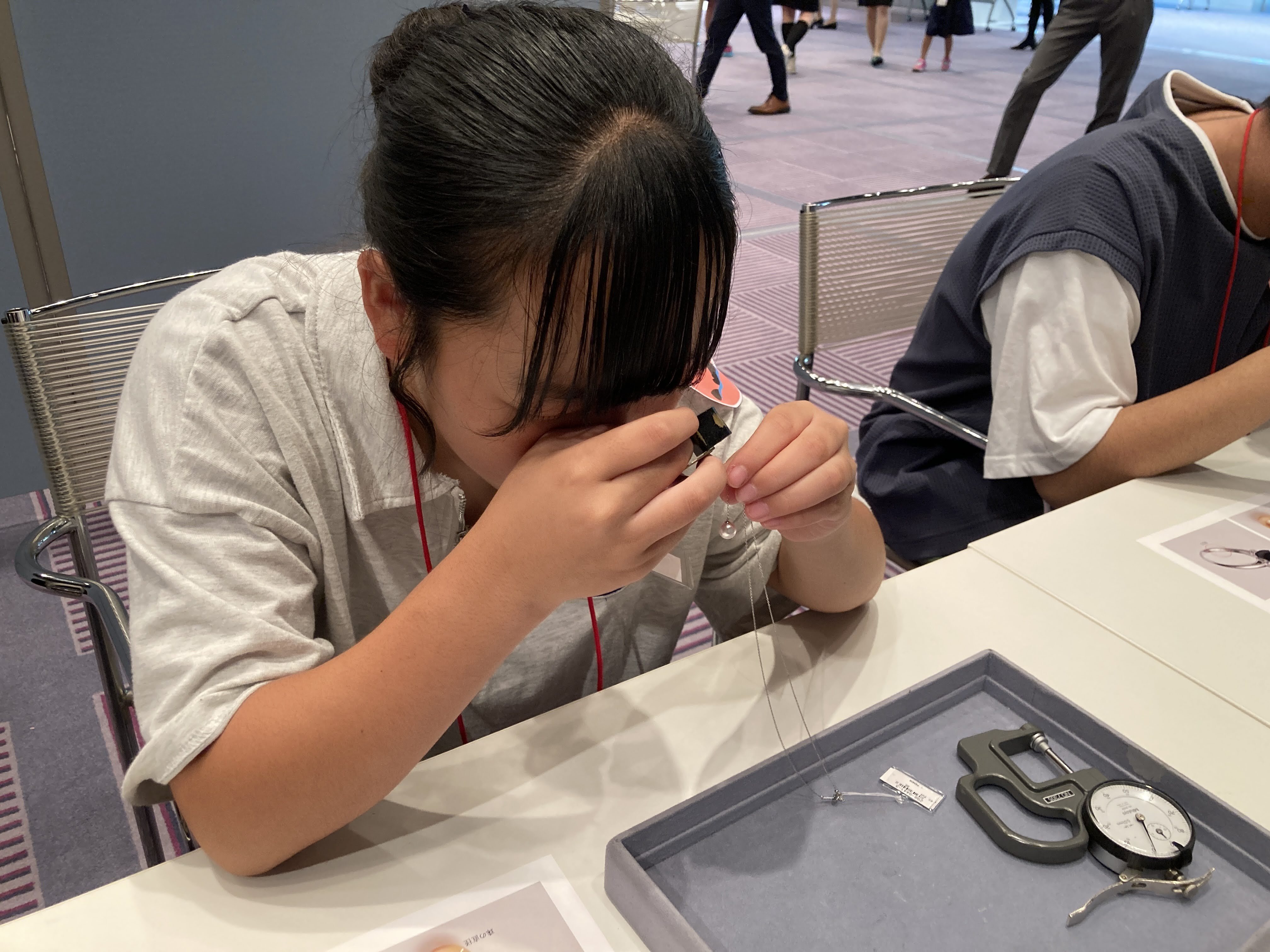 中学生以上は、ペンダントや指輪の真珠のサイズ・使われている素材をチェックし、宝飾部が行っている商品説明書作成を行いました。