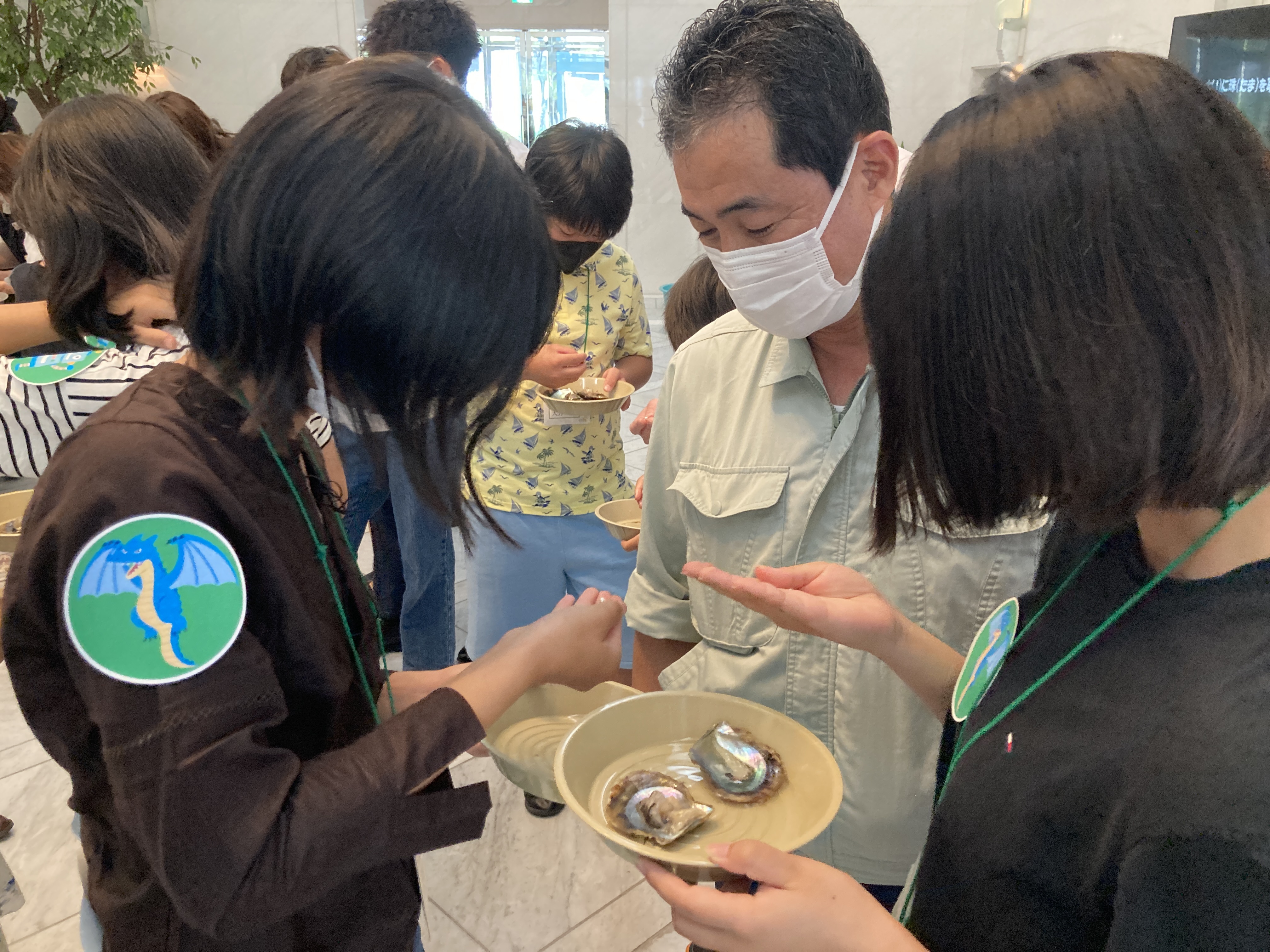 アコヤ貝と真珠について学んで、1人ずつ貝から真珠を採り出しました。