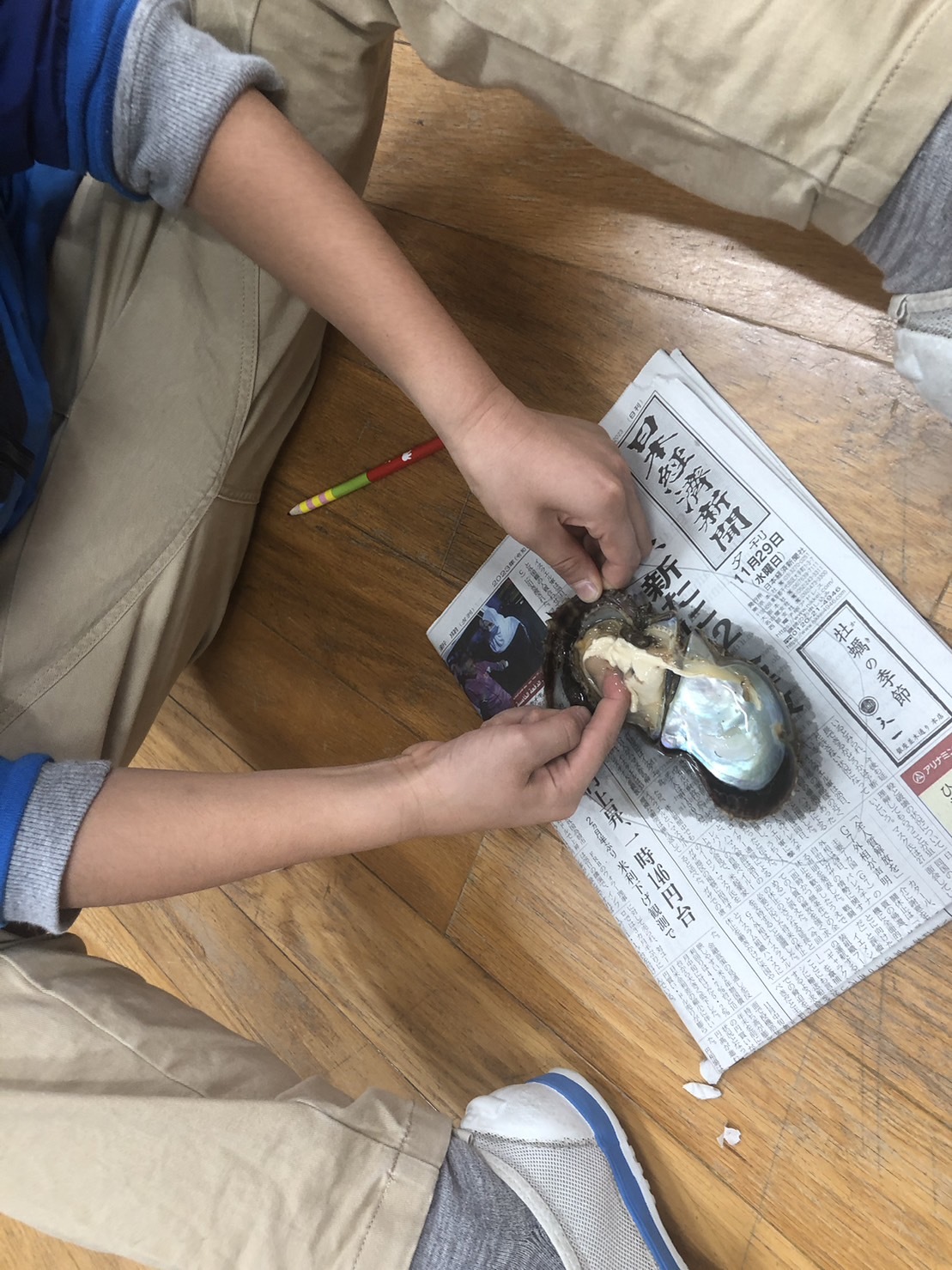 まずは、前回は見ることが出来なかった貝の中身を観察しました。そして指で中身を触って真珠を探し出します。