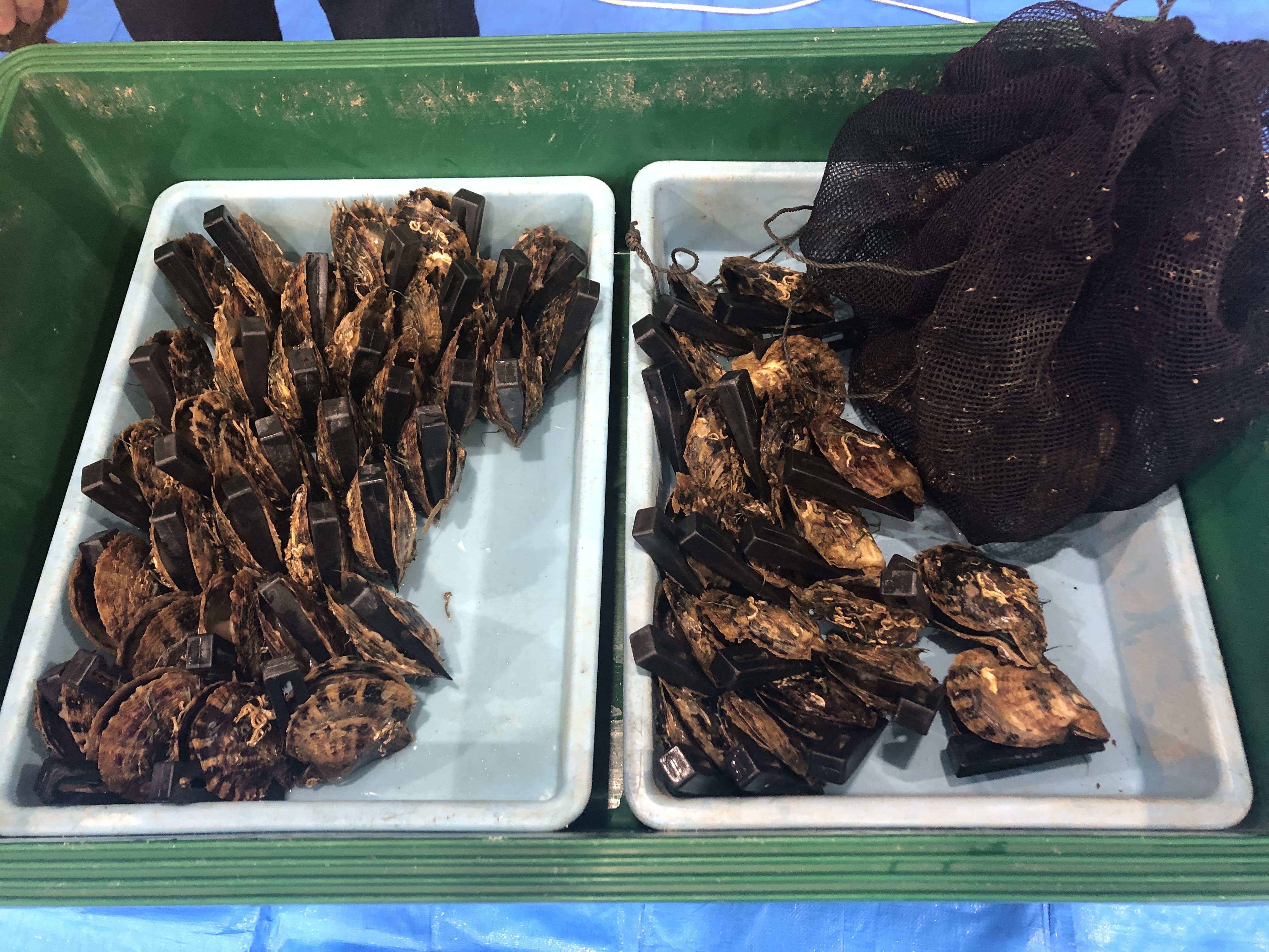この日、アコヤ貝の体内に真珠の元となる核を入れる、挿核作業を行いました。移植式で挿核した60個と、事前に三重県にある大月真珠の賢島養殖場で挿核した360個と合わせて420個の貝を育てていきます。